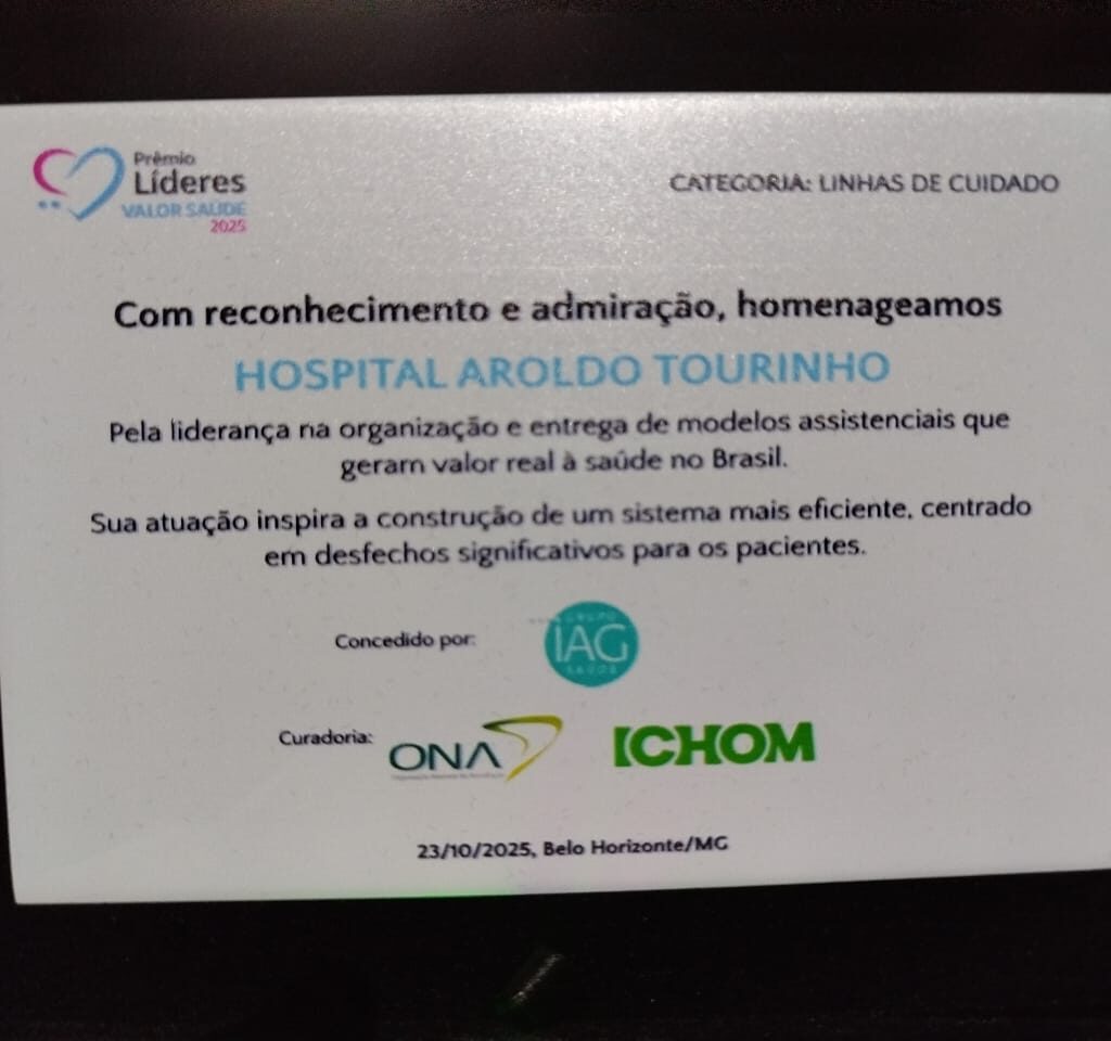 O Hospital Aroldo Tourinho recebeu, nesta quinta-feira, em Belo Horizonte, o “Prêmio Líderes Valor em Saúde 2025”, concedido pelo Grupo IAG Saúde, com curadoria da ONA (Organização Nacional de Acreditação) e do ICHOM (International Consortium for Health Outcomes Measurement), pela excelência na prestação de serviços na linha de cuidados da Insuficiência Cardíaca Congestiva, com base nos dados apurados entre julho de 2024 a junho de 2025 pela plataforma DRG Brasil, demonstrando excelência em dois aspectos fundamentais, que é a mortalidade hospitalar igual ou abaixo da média dos demais hospitais, considerando a complexidade clínica dos pacientes, e a do custo assistencial per capita igual ou inferior a média. O “Prêmio Líderes Valor em Saúde 2025” foi entregue a apenas 43 instituições de saúde de Minas Gerais.